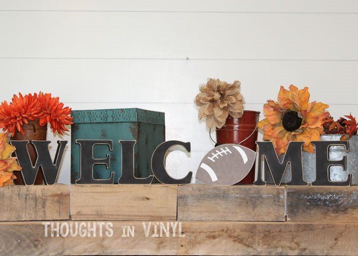 Overall size of WELCOME (with the shape) is roughly 5 1/2" tall x 35" wide. The letters are 1 1/8" thick so they won't tip over.