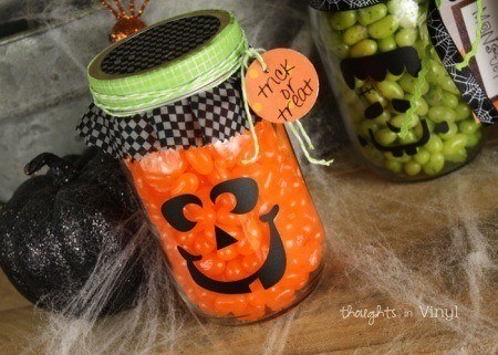 Simply apply the vinyl decal to your mason jar (we used pint size jars), and then fill with candy. Add some ribbon to dress it up a bit. You can even wrap washi tape around the mason jar lid for a fun pop of color. Mason Jar not included. Purchase is for vinyl only.