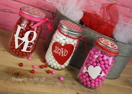 Simply apply the vinyl decal to your mason jar (we used pint size jars), and then fill with candy. Add some ribbon to dress it up a bit. You can even wrap washi tape around the mason jar lid for a fun pop of color. Mason Jar not included.