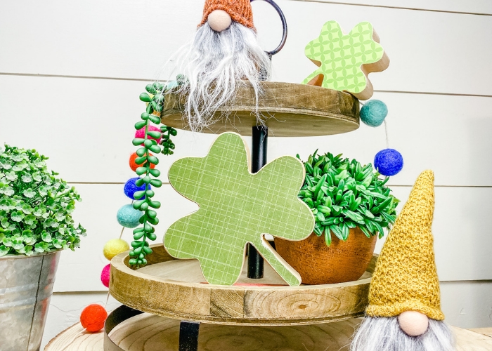 This darling shamrock pair is the perfect size for your tiered tray or grouped together with other St. Patrick's Day crafts. Paint the shamrocks or modpodge some colorful St. Patrick's Day scrapbook paper onto the wood. So easy and so cute.
