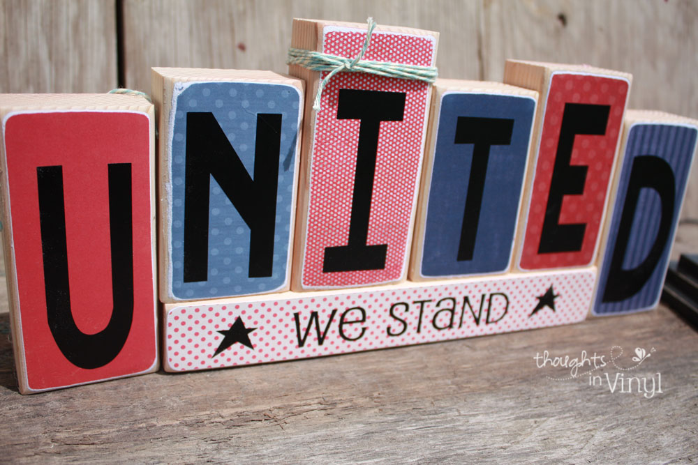 You can either paint your blocks and apply the vinyl, or modpodge colorful scrapbook paper onto them for quick and easy color!
