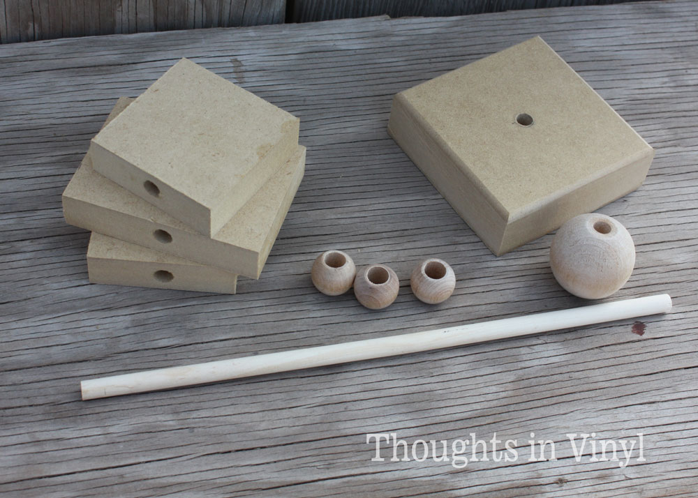 The top and bottom photo blocks are 2.5″ squares and the middle photo block is 2.5″ x 3.5″.  Wood is MDF.