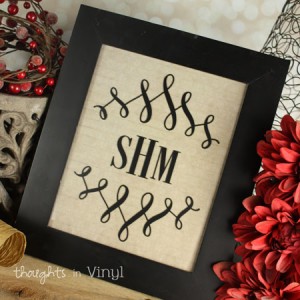 This is cute and trendy looking monogram.  Simply apply the vinyl decal to the glass front of a frame and place some decorative scrapbook paper behind the glass.